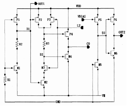 當(dāng)鋰電池接上充電器進(jìn)行充電時(shí), VM端相當(dāng)于充電器的負(fù)端(見圖1) ,產(chǎn)生一個(gè)- 4V左右的脈沖電壓,N1管瞬間導(dǎo)通,同時(shí)OUT1端也產(chǎn)生- 4V的脈沖電壓,當(dāng)邏輯電路監(jiān)測(cè)到OUTI端的負(fù)脈沖電壓后通過邏輯控制使L2 為高電位,使N3 管導(dǎo)通,又因?yàn)镻1管的柵極接地,當(dāng)VDD大于P1管的閾值電壓時(shí), P1 管導(dǎo)通, D1 點(diǎn)為高電位, N2 管導(dǎo)通,D2點(diǎn)為低電位, P4管導(dǎo)通, CO為高電位,充電控制用FET2打開,允許充電,即充電器檢測(cè)完成?! ?br />