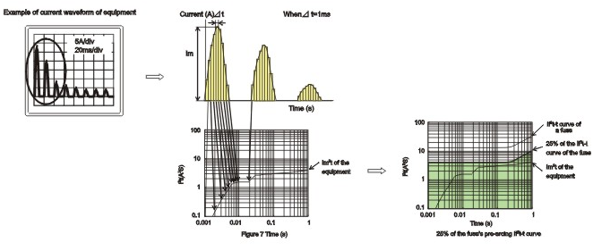 由于開關電源的出現(xiàn),使得線路中的浪涌電流變得復雜,多變,不同的浪涌電流或工作電流波形產生的能量是不同的,電路設計者要了解回路中出現(xiàn)的浪涌電流或工作電流的波形,以適當?shù)剡x擇熔斷的工作電流。參照圖 (3)