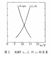IGBT的短路電流和柵壓有密切關系,柵壓越高,短路時電流就越大。在短路或瞬態(tài)過流情況下若能在瞬間將vGS分步減少或斜坡減少,這樣短路電流便會減小下來,當IGBT關斷時,di/dt也減小。集成驅動電路如EXB841或M579xx系列都有檢測vCES電路,當發(fā)現(xiàn)欠飽和時,柵壓箝位到10V左右,增大vCES,限制過電流幅值,延長允許過流時間。短路允許時間tsc和短路電流Isc同柵極電壓vG的關系如圖2所示。