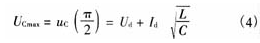 假設逆變關斷時濾波電感中的電流全部從電容C中流過,同時整流器繼續(xù)輸出電壓Ud。圖6給出了等效電路,L與C串聯(lián)諧振,由于整流橋電流只能單向流通,所以振蕩到T/4時結束。