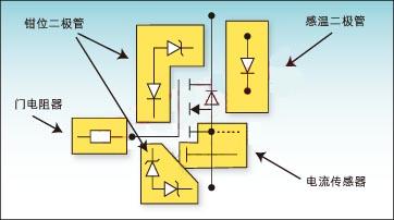 突出顯示的元件組成一個(gè)特性板,可以將其中的功能集成到MOSFET中。這些元件從右上角開始按順時(shí)針方向?yàn)椋簻囟雀袘?yīng)二極管、電流傳感器、鉗位二極管(內(nèi)部二極管,未顯示)和門電阻器。通過加入鉗位二極管和門電阻器眾所周知的保護(hù)特性,可以保護(hù)對(duì)電壓敏感的柵氧化層免受危險(xiǎn)電場的破壞。