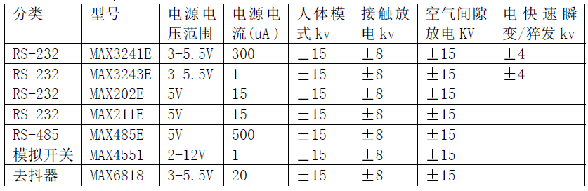 收的COM 端口需要8 個(gè)TransZorb?二極管費(fèi)用高達(dá)$2一種有效的方法是采用內(nèi)部集成ESD 防護(hù)功能的串行接口器件這種器件比普通無防護(hù)功能的器件價(jià)格要貴但增加的費(fèi)用比起外加防護(hù)二極管的費(fèi)用要低內(nèi)部集成的ESD,防護(hù)電路不會(huì)增加任何輸入輸出管腳的等效電容也節(jié)省了電路板面積MAXIM公司近幾年發(fā)展了享有專利的集成ESD防護(hù)技術(shù)并可提供全系列的ESD防護(hù)串行接口器件包括與標(biāo)準(zhǔn)器件完全兼容的產(chǎn)品MAXIM公司還將同樣的技術(shù)應(yīng)用到模擬開關(guān)和開關(guān)去抖產(chǎn)品中所有這些器件的ESD 防護(hù)能力都符合15kV IEC1000-4-2 氣隙放電8kVIEC1000-4-2 接觸放電15kV人體模型HBM 測(cè)試標(biāo)準(zhǔn)下表是MAXIM公司具有抗靜電功能的器件。