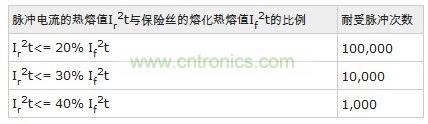 每次脈沖沖擊保險絲,保險絲都會受到一定的損傷,經(jīng)過多次反復(fù)沖擊保險絲就會熔斷。以下為AEM產(chǎn)品耐受沖擊次數(shù)的表格: