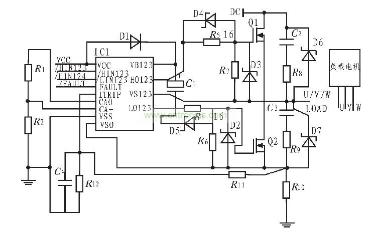 圖3是由IR2130組成的無(wú)刷直流電機(jī)驅(qū)動(dòng)原理圖為便于表示只畫(huà)出其中一個(gè)橋臂的電路示意圖,通過(guò)IR2130輸入信號(hào)控制MOSFET的開(kāi)關(guān),由此驅(qū)動(dòng)無(wú)刷直流動(dòng)機(jī)。C1是自舉電容,為上橋臂功率管驅(qū)動(dòng)的懸浮電源存儲(chǔ)能量,D1的作用是防止上橋臂導(dǎo)通時(shí)母線電壓倒流到IR2130的電源上而使器件損壞,因此D1應(yīng)有足夠的反向耐壓,當(dāng)然D1與C1串聯(lián)也是為了滿(mǎn)足主電路功率開(kāi)關(guān)頻率的要求,D1應(yīng)選快速恢復(fù)二極管。 R1、R2、R10、R11、R12、C4組成過(guò)流檢測(cè)電路。R5、R6為柵極驅(qū)動(dòng)電阻,D4、D5為功率管提供了一個(gè)低阻抗的放電回路,使功率管能夠快速的泄放電荷。