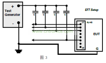 檢查設(shè)備的 EFT 免疫力(根據(jù) IEC61000-4-4 標(biāo)準(zhǔn)),與共模雷擊浪涌測試非常相似。在如圖 3 所示比較典型的配置中,所有的導(dǎo)體(或引腳)電容耦合到測試信號發(fā)生器的正極和“浪涌”到 GND。如果數(shù)據(jù)線幾乎沒有差別,線對之間很少有異模能量,但變壓器耦合電容會再次將共模能量以衰減的方式傳輸?shù)津?qū)動端。
