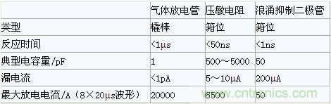 4、氣體放電管與其它浪涌抑制器件參數(shù)比較