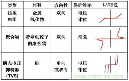 安森美半導(dǎo)體來(lái)自美國(guó)的ESD保護(hù)專家Robert Ashton博士說(shuō),一般而言,ESD保護(hù)元件的分類可以通過其保護(hù)策略與方向性來(lái)進(jìn)行,主要包括壓敏電阻、聚合物和瞬態(tài)電壓抑 制器(TVS)等,如表1所示。在這幾種保護(hù)元件中,壓敏電阻在低電壓時(shí),呈現(xiàn)出高電阻,其中的每個(gè)小型二極管兩端的電壓都相當(dāng)?shù)停瑫r(shí)電流也相當(dāng)?。欢谳^高電壓時(shí),其中的獨(dú)立二極管開始導(dǎo)通,同時(shí)壓敏電阻的電阻會(huì)下降。從表1中我們也可以看出壓敏電阻為雙向保護(hù)元件。而對(duì)于帶導(dǎo)電粒子的聚合物而言,在正常電壓下,這些材料擁有相當(dāng)高的電阻,但當(dāng)發(fā)生ESD沖擊時(shí),導(dǎo)電粒子間的小間隙會(huì)成為突波音隙陣列,從而帶來(lái)低電阻路徑。