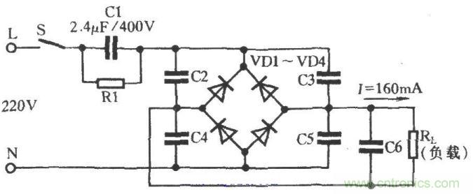 如圖是用電容器代替常用的變壓器,將市電220V降至整流器所需要的交流低電壓電路。在電路中主要由電容器C1降壓,耐壓值為400V;C1的電容量依據(jù)輸出電流確定。在220V/50Hz條件下,電容器C1的取值與輸出電流按下式估算: C=15I 式中:I為輸出電流,單位為A;C的單位為μF。 元件選擇:C1可用紙介金屬膜電容器或紙介油浸電容器,耐壓為400V。為了避免電源斷開C1上仍有電荷,所以在C1兩端跨接了一只1MΩ的泄放電阻R1。電容器C2、C3、C4、C5均為消除調(diào)制交流聲和其他高頻干擾而設(shè)置的。C6為濾波電容器,RL為負(fù)載電阻器。