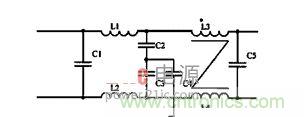EMI濾波技術(shù)是一種抑制尖脈沖干擾的有效措施,可以濾除多種原因產(chǎn)生的傳導(dǎo)干擾。圖3是一種由電容、電感組成的EMI濾波器,接在開關(guān)電源的輸入端。電路中,C1、C5是高頻旁路電容, 用于濾除兩輸入電源線間的差模干擾;L1與C2、C4;L2與C3、C4組成共模干擾濾波環(huán)節(jié),用于濾除電源線與地之間非對(duì)稱的共模干擾;L3、L4的初次級(jí)匝數(shù)相等、極性相反,交流電流在磁芯中產(chǎn)生的磁通相反,因而可有效地抑制共模干擾。測(cè)試表明,只要適當(dāng)選擇元器件的參數(shù),便可較好地抑制開關(guān)電源產(chǎn)生的傳導(dǎo)干擾。