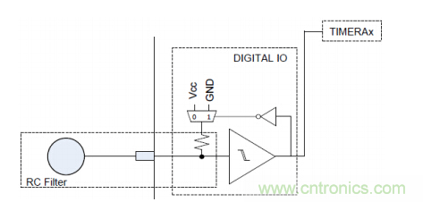 MSP430根據(jù)型號(hào)的不同支持多種電容觸摸檢測方式,有RC 震蕩、比較器、PIN RO,本設(shè)計(jì)使用的是PIN Relaxation Oscillator 方式,原理如圖,芯片管腳內(nèi)部檢測電路由施密特