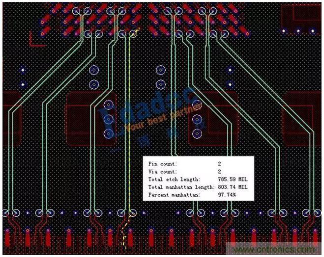 連接器采用的是CFP2的表貼連接器,由于PHY芯片到光口連接器距離很短,所以當(dāng)初設(shè)計(jì)的時(shí)候就直接從芯片打孔連線過來,沒有經(jīng)過任何特殊的處理,最后板上走線總長(zhǎng)度約800mil,如下圖一所示。