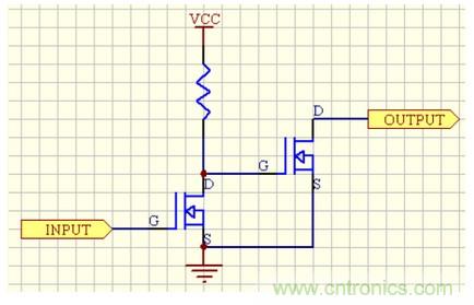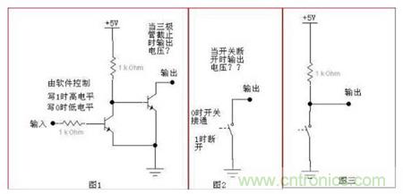 我們將圖1簡(jiǎn)化成圖2的樣子。圖2中的開(kāi)關(guān)受軟件控制,“1”時(shí)斷開(kāi),“0”時(shí)閉合。很明顯可以看出,當(dāng)開(kāi)關(guān)閉合時(shí),輸出直接接地,所以輸出電平為0。而當(dāng)開(kāi)關(guān)斷開(kāi)時(shí),則輸出端懸空了,即高阻態(tài)。這時(shí)電平狀態(tài)未知,如果后面一個(gè)電阻負(fù)載(即使很輕的負(fù)載)到地,那么輸出端的電平就被這個(gè)負(fù)載拉到低電平了,所以這個(gè)電路是不能輸出高電平的。