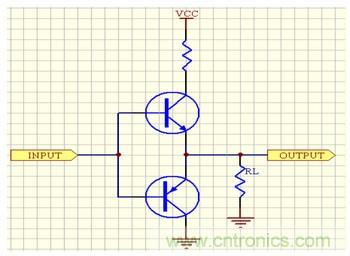 集電極開(kāi)路輸出的結(jié)構(gòu)如圖1所示,右邊的那個(gè)三極管集電極什么都不接,所以叫做集電極開(kāi)路(左邊的三極管為反相之用,使輸入為"0"時(shí),輸出也為"0")。對(duì)于圖1,當(dāng)左端的輸入為“0”時(shí),前面的三極管截止(即集電極C跟發(fā)射極E之間相當(dāng)于斷開(kāi)),所以5V電源通過(guò)1K電阻加到右邊的三極管上,右邊的三極管導(dǎo)通(即相當(dāng)于一個(gè)