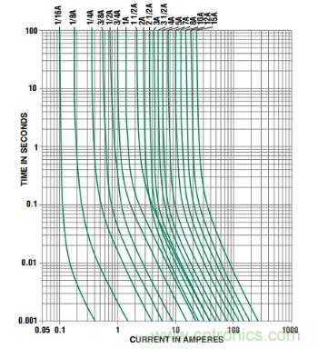 如圖所示為溫度降額曲線,以曲線A為例,在溫度為80℃時,Tf為0.75。因此,若不考慮其他特性的影響,對3A的應(yīng)用,至少應(yīng)選擇4A(3/0.75=4)的保險絲。