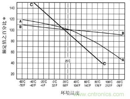 同半導(dǎo)體一樣,保險絲也是溫度敏感器件。隨著溫度升高,其額定工作電流需要進行相應(yīng)的降額。這很容易理解,本身保險絲就是依靠熱量來將其熔斷的,其溫度等于環(huán)境溫度加上工作時的溫升,當環(huán)境溫度較高時,有必要使其自身溫升降低,因此需對額定電流降額??梢杂脺囟日蹨p率(Tf)來表示相應(yīng)的降額系數(shù)。