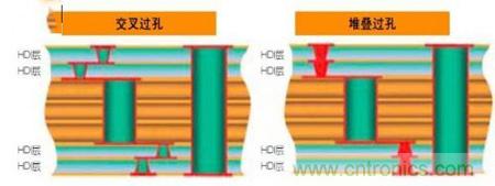 推薦使用深度最多6層的盲孔/埋孔配置。層數(shù)再多會(huì)引起制造良率問(wèn)題。優(yōu)選技術(shù)是使用交叉過(guò)孔或堆疊過(guò)孔,如圖8所示。交叉過(guò)孔允許更加精確的注冊(cè)公差,因?yàn)樗鼈儾幌穸询B過(guò)孔那樣強(qiáng)制要求完美對(duì)齊。