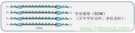 空分復(fù)用,通常被稱為并行光纖,是一種通過在復(fù)合鏈路中增加一條或多條光纖來增加一個(gè)或多個(gè)通道的方式。在這種情況下,一個(gè)通道實(shí)際上就是另一股光纖。這是上述時(shí)分復(fù)用通道的一個(gè)替代方案,在時(shí)分復(fù)用中,信號(hào)以按時(shí)間合并在同一條光纖上。行業(yè)中有很多應(yīng)用這種技術(shù)的例子。例如,40G SR4通過使用四通道或光纖,在多模光纖上提供40Gbps的速率。也就是在每個(gè)方向上有四個(gè)通道。這也正是“SR4”中4的含義,4個(gè)通道,每個(gè)10Gbps。