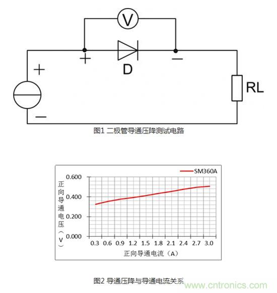 在二極管兩端加正向偏置電壓時,其內(nèi)部電場區(qū)域變窄,可以有較大的正向擴散電流通過PN結(jié)。只有當正向電壓達到某一數(shù)值(這一數(shù)值稱為“門檻電壓”,鍺管約為0.2V,硅管約為0.6V)以后,二極管才能真正導通。但二極管的導通壓降是恒定不變的嗎?它與正向擴散電流又存在什么樣的關系?通過下圖1的測試電路在常溫下對型號為SM360A的二極管進行導通電流與導通壓降的關系測試,可得到如圖2所示的曲線關系:正向?qū)▔航蹬c導通電流成正比,其浮動壓差為0.2V。從輕載導通電流到額定導通電流的壓差雖僅為0.2V,但對于功率二極管來說它不僅影響效率也影響二極管的溫升,所以在價格條件允許下,盡量選擇導通壓降小、額定工作電流較實際電流高一倍的二極管。