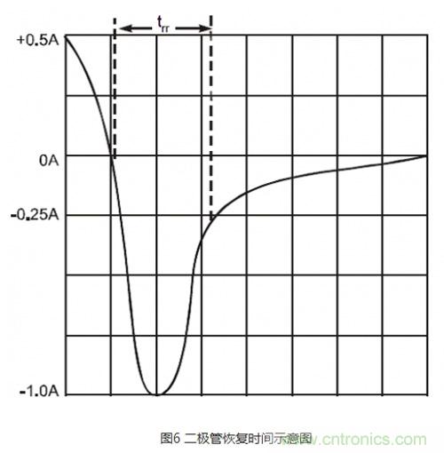 如圖6所示,二極管的反向恢復時間為電流通過零點由正向轉(zhuǎn)換成反向,再由反向轉(zhuǎn)換到規(guī)定低值的時間間隔,實際上是釋放二極管在正向?qū)ㄆ陂g向PN結(jié)的擴散電容中儲存的電荷。反向恢復時間決定了二極管能在多高頻率的連續(xù)脈沖下做開關使用,如果反向脈沖的持續(xù)時間比反向恢復時間短,則二極管在正向、反向均可導通就起不到開關的作用。PN結(jié)中儲存的電荷量與反向電壓共同決定了反向恢復時間,而在高頻脈沖下不但會使其損耗加重,也會引起較大的電磁干擾。所以知道二極管的反向恢復時間正確選擇二極管和合理設計電路是必要的,選擇二極管時應盡量選擇PN結(jié)電容小、反向恢復時間短的,但大多數(shù)廠家都不提供該參數(shù)數(shù)據(jù)。