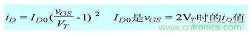 在轉(zhuǎn)移特性曲線上,gm 是曲線在某點(diǎn)上的斜率,也可由iD的表達(dá)式求導(dǎo)得出,單位為 S 或 mS。