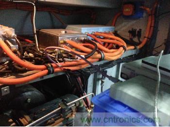 遠(yuǎn)離干擾源是最簡(jiǎn)單的抗干擾方法,如果CAN線與強(qiáng)電干擾源遠(yuǎn)離0.5米,干擾就基本影響不到了??墒窃趯?shí)際布線中,經(jīng)常遇到空間太小而不得不和強(qiáng)電混在一起,如圖12所示,為某新能源汽車(chē)的驅(qū)動(dòng)系統(tǒng),CAN線與驅(qū)動(dòng)線混在一起,結(jié)果導(dǎo)致干擾很大。只要與CAN并行的驅(qū)動(dòng)線,具備2A/秒的電流變化,就會(huì)耦合出強(qiáng)磁場(chǎng)而導(dǎo)致CAN線上出現(xiàn)干擾脈沖。所以CAN線必須要和電流會(huì)劇烈變化的線纜遠(yuǎn)離。比如繼電器、電磁閥、逆變器、電機(jī)驅(qū)動(dòng)線等。