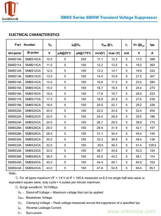 從規(guī)格書上來看,SM8S系列產(chǎn)品的功率都在6600W,通過的峰值電流由于電壓不同而變化,電壓越大,電流越小。先列出規(guī)格書來看下: