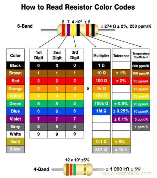 這里有一張簡單的圖表,可以解釋電阻器的顏色編碼規(guī)則。