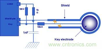 在STM8S的解決方案中,ST提供了感應(yīng)電極和走線(xiàn)的設(shè)計(jì)規(guī)范和如圖3所示的Driven Shield功能(在Shield線(xiàn)上提供與按鍵管腳相同的驅(qū)動(dòng)信號(hào),電極與Shield之間的寄生電容就不會(huì)被充放電),能有效地減少感應(yīng)電極走線(xiàn)的寄生電容對(duì)按鍵靈敏度的影響。