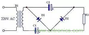 二倍壓整流電路還有另外一種形式的畫法,見圖15,其原理與圖12完全一致,只是表現(xiàn)形式不一樣。