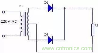 半波整流電路見下圖。其中B1是電源變壓器,D1是整流二極管,R1是負載。B1次級是一個方向和大小隨時間變化的正弦波電壓,波形如圖2所示。0~π期間是這個電壓的正半周,這時B1次級上端為正下端為負,二極管D1正向?qū)?,電源電壓加到負載R1上,負載R1中有電流通過;π~2π期間是這個電壓的負半周,這時B1次級上端為負下端為正,二極管D1反向截止,沒有電壓加到負載R1上,負載R1中沒有電流通過。在 2π~3π、3π~4π等后續(xù)周期中重復上述過程,這樣電源負半周的波形被“削”掉,得到一個單一方向的電壓,波形如圖3所示。由于這樣得到的電壓波形大小還是隨時間變化,我們稱其為脈動直流。