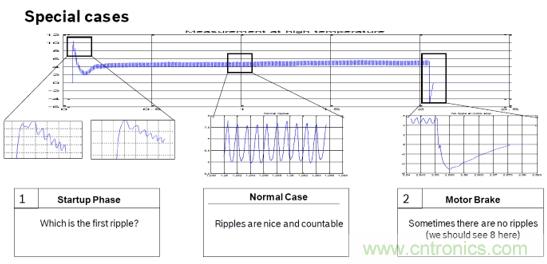 由于電機(jī)在啟動,停止,反轉(zhuǎn),堵轉(zhuǎn)時(shí)的紋波特征不明顯。如圖5和圖6,不能精準(zhǔn)的計(jì)數(shù)紋波個(gè)數(shù)。只能通過算法進(jìn)行補(bǔ)償。這樣紋波計(jì)數(shù)必然和實(shí)際的必然存在誤差。而這誤差隨著車窗操作次數(shù)的增加,誤差也會跟著累積。