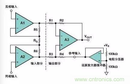 圖9.利用低輸出阻抗運(yùn)算放大器驅(qū)動儀表放大器的參考電壓輸入端
