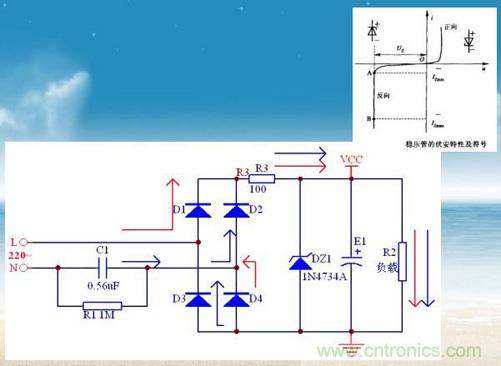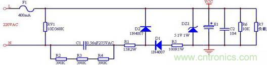 采用半波整流方式,根據(jù)計(jì)算式I1=0.5|I|=34500C可知,C=0.43uF。所以此處選用0.47uF的電容,反過(guò)來(lái)可以驗(yàn)證提供的電流I1=34500C=16.2mA,多余電流從穩(wěn)壓管流過(guò)。