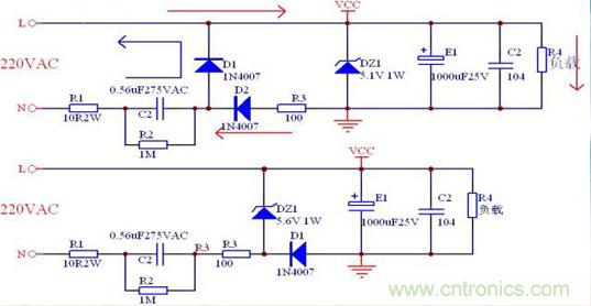 阻容降壓是一種利用電容在一定頻率的交流信號(hào)下產(chǎn)生的容抗來(lái)限制最大工作電流的電路。
