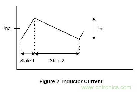 因此,當(dāng)電感上的電壓為正時(狀態(tài)1),電感上的電流就會增加;當(dāng)電感上的電壓為負(fù)時(狀態(tài)2),電感上的電流就會減小。通過電感的電流如圖2所示: