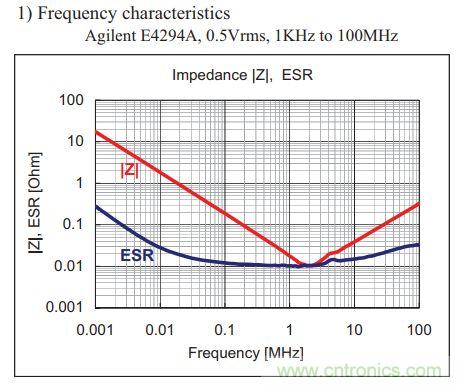 MLCC有經(jīng)典的V型阻抗-頻率曲線。隨著頻率升高,寄生電感的影響開始凸顯,阻抗先變小再變大,這是MLCC的固有特性。曲線中的最低點(diǎn)就是MLCC的自諧振頻率。