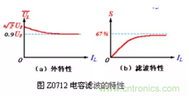 4. 電容濾波電路的外特性(指UL與IL之間的關(guān)系)和脈動特性(指S與IL 之間的關(guān)系)比較差,如圖Z0712 所示??梢钥闯鲚敵鲭妷篣L和脈動系數(shù)S隨著輸出電流IL 的變化而變化。當(dāng)IL=0(即RL= ∞ )時,UL = U2(電容充電到最大值后不再放電),S = 0。當(dāng)IL增大(即RL減?。r,由于電容放電程度加快而使UL下降,UL 的變化范圍在 U2 ~0.9 U2之間(指全波或橋式),S變大。所以,電容濾波一般適用于負(fù)載電流變化不大的場合。