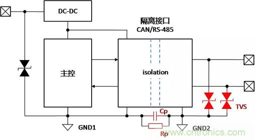 帶隔離通信接口的設(shè)備,在不同的使用、安裝狀態(tài)下,接口會表現(xiàn)出完全不同的ESD特性,了解設(shè)備在不同的使用狀態(tài)下,ESD對接口的影響的機(jī)理,才能有針對性地增加保護(hù)器件,提升隔離接口的ESD能力。下面以帶有隔離CAN或RS-485通信接口為例,對常見的設(shè)備狀態(tài)下,ESD的作用機(jī)理進(jìn)行分析,并提出相應(yīng)的改善措施。