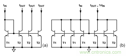圖2. (a) 多級電流鏡 (b) 非整數(shù)比例電流鏡可將 3 個(gè) T2 集電極結(jié)合起來,得到 3IIN