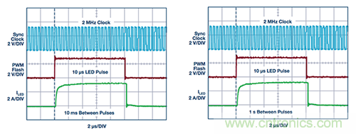 圖2. 無論PWM關斷時間是多少,圖1所示并聯(lián)LED驅動器的3 A相機閃光波形看起來相同。波形顯示,(a) 10 ms之后和(b) 1 s之后的10μs脈沖是相同的。經過一天或更長的PWM關斷時間之后,LT3932 LED閃光波形看起來也相同。