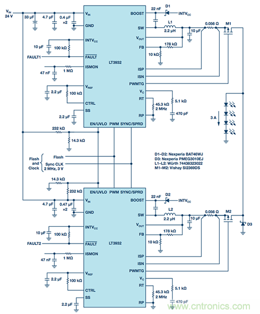 LT3932的專有閃光技術可以擴展,驅動器可以并聯(lián)以提供更高的LED閃光電流。所需的閃光形狀和完整性保持不變。圖1顯示了并聯(lián)兩個驅動器以支持3 A相機閃光燈是多么容易,高達4 A的設計也是可行的。