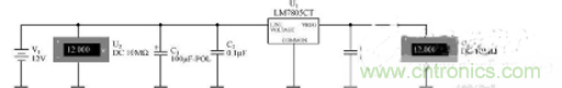 對圖2 所示的電路進行仿真,其中電容C1、C2、C3的容量分別為100μF、0.1μF、0.1μF,輸入+12V的直流信號,使用兩個電壓表來觀察輸入/輸出的結果。
