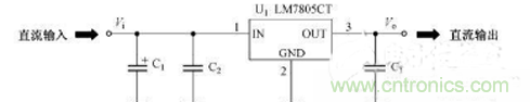 電容在穩(wěn)壓電路中的有什么作用呢?在分析電容在穩(wěn)壓電路中的作用中,它有兩類電子元件,一類是本章將要介紹的電容,圖中標號為C1、C2、C3;另一類是三端穩(wěn)壓集成電路LM7805,圖中標號為U1。LM7805是一種三端穩(wěn)壓集成電路,它可以將電壓值為7~30V的直流輸入信號轉為電壓值為5V的直流信號輸出。