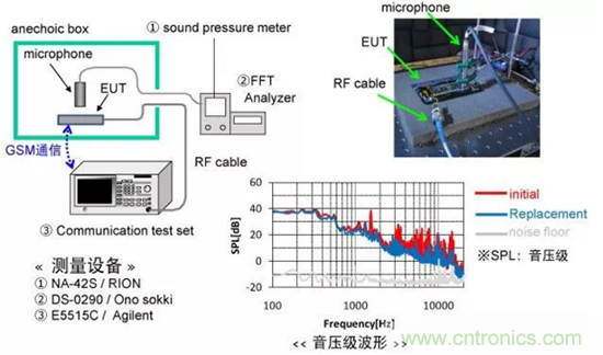 本次置換評(píng)估中,對(duì)GSM通信時(shí)的①發(fā)射特性、②蓄電池的電壓變動(dòng)和③嘯叫進(jìn)行評(píng)估。