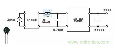 各種電源電路和外圍電路緊湊地集成到一起的內(nèi)置電源稱為電源模塊。交流-直流電源模塊是由交流-直流整流電路、直流-直流轉(zhuǎn)換器以及少量外部零部件組成的電源,可以形成一個節(jié)省空間的優(yōu)化電源系統(tǒng)。插入一個NTC熱敏電阻(電源熱敏電阻)可以有效地限制在通電時施加到輸入和輸出電容器上勵磁涌流。