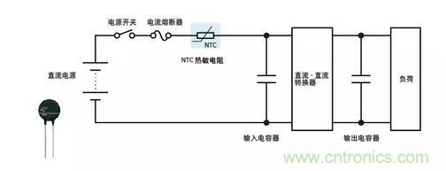 在直流-直流轉(zhuǎn)換器等的直流電源電路等中,NTC熱敏電阻用作電源熱敏電阻,有效地限制勵磁涌流,輸入和輸出電容器在接通電源時充電。NTC熱敏電阻的電阻在通電后變得非常低,達(dá)到比使用固定電阻時更低的功率損耗。