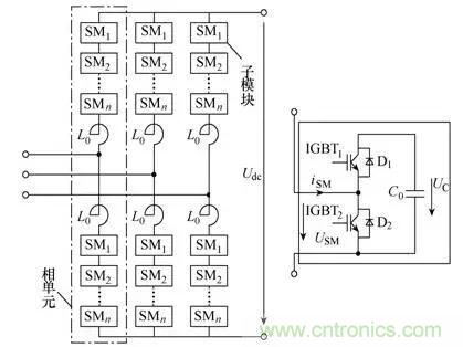西門子公司為此設(shè)計(jì)了一種由多個(gè)子模塊串聯(lián)的模塊化多電平換流器(modular multilevel converter, MMC)。這種結(jié)構(gòu)的換流器可以使全控型功率器件運(yùn)行在較低的開(kāi)關(guān)頻率,大大降低了電磁干擾和損耗;同時(shí)采用排序充放電電容的均壓策略,可以輕松實(shí)現(xiàn)數(shù)量龐大的級(jí)聯(lián)模塊的動(dòng)態(tài)均壓;其模塊化結(jié)構(gòu),也便于安裝及日后的維護(hù)。因此,我國(guó)近幾年的柔直工程換流器均采用MMC結(jié)構(gòu)。