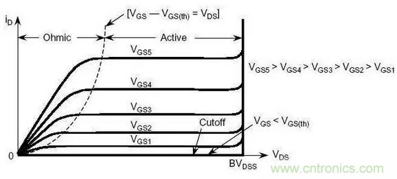 該參數反映了器件可以處理的脈沖電流的高低,脈沖電流要遠高于連續(xù)的直流電流。定義IDM的目的在于:線的歐姆區(qū)。對于一定的柵-源電壓,MOSFET導通后,存在最大的漏極電流。如圖所示,對于給定的一個柵-源電壓,如果工作點位于線性區(qū)域內,漏極電流的增大會提高漏-源電壓,由此增大導通損耗。長時間工作在大功率之下,將導致器件失效。因此,在典型柵極驅動電壓下,需要將額定IDM設定在區(qū)域之下。區(qū)域的分界點在Vgs和曲線相交點。