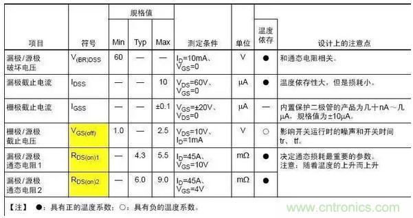 VGS(th)是指加的柵源電壓能使漏極開始有電流,或關斷MOSFET時電流消失時的電壓,測試的條件(漏極電流,漏源電壓,結溫)也是有規(guī)格的。正常情況下,所有的MOS柵極器件的閾值電壓都會有所不同。因此,VGS(th)的變化范圍是規(guī)定好的。VGS(th)是負溫度系數,當溫度上升時,MOSFET將會在比較低的柵源電壓下開啟。