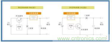 由于電源電路的功率電感器中會(huì)流過大電流,因此繞組型為主流產(chǎn)品。這是因?yàn)?,通過將高導(dǎo)磁率的磁性體(鐵氧體或軟磁性金屬)用于磁芯中,以較少巻數(shù)實(shí)現(xiàn)高電感值,從而可使產(chǎn)品更為小型化。圖3所示為使用功率電感器的DC-DC轉(zhuǎn)換器(非絕緣型及斬波方式)基本電路。